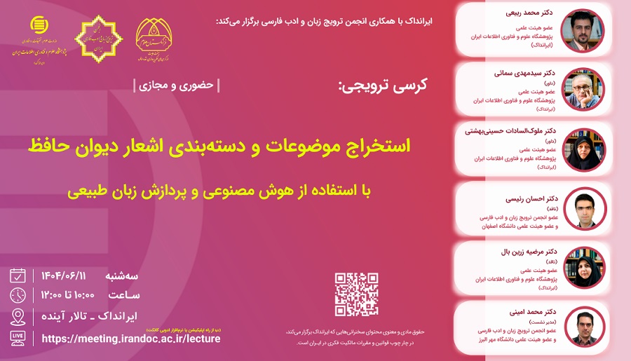 برای درک اندیشه ناب این شاعر بزرگ، تنها ابزار مطمئن، دیوان اشعار اوست و شرط موفقیت در این راه، پیش‌داوری نکردن و عدم تأثیر سلیقه شخصی در تفسیر دیدگاه‌های او است (هومن، ۱۳۵۳). از همین رو در این کرسی به دنبال آن هستیم تا با استفاده از تکنیک‌های متن‌کاوی  و پردازش زبان طبیعی ، به صورت مستقل از نظر خبرگان استخراج موضوعات و دسته‌بندی اشعار حافظ در این موضوعات رو مورد بحث و بررسی قرار دهیم.